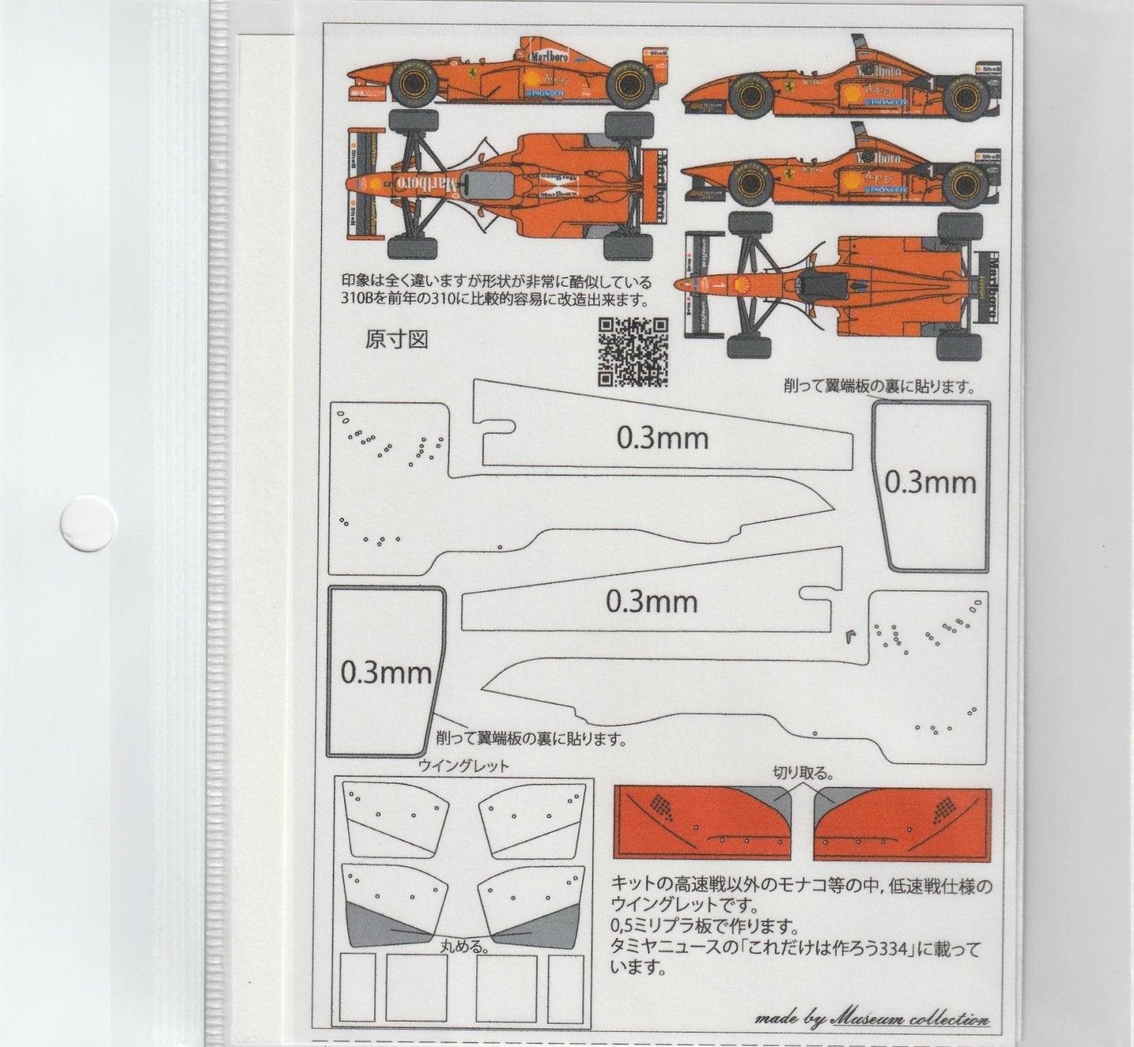 F310はF310Bをベースに改造出来ます。 サスペンションアームなどそのまま使えるので改造は簡単です。 ノーズ付け替えでエンジンカウルも開閉します。 画像の310古いので無くしてしまってインダクションボックスは 写っていませんがインダクションボックス用のロゴも入っています。